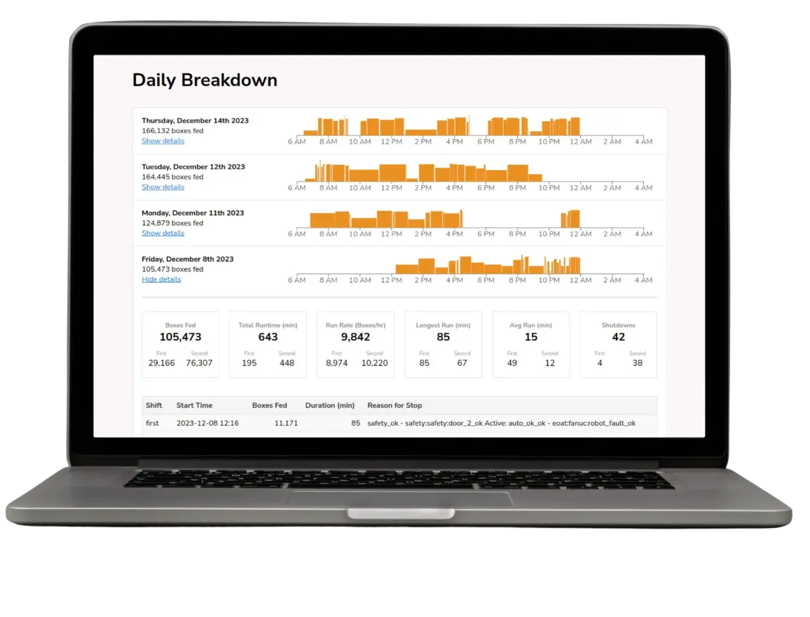 No more lost time trying to figure out productivity deltas between one shift to the next. Login and get the answers you need in minutes to help streamline your operation.